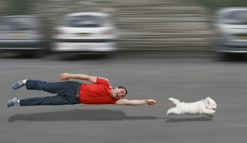 Starkes Ziehen an der Leine ist wohl das Paradebeispiel für anerzogenes Fehlverhalten. Ich erlebe immer wieder, dass schon Welpen an der Flexileine, leider oft auch noch mit Halsband statt Brustgeschirr, geführt werden. Wobei man sich sehr oft fragt: Wer führt hier wen? Der Halter den Welpen oder der Welpe den Halter? Das Hundebaby geht voraus, oft an der komplett ausgefahrenen Flexileine, und der Halter zottelt verliebt grinsend hinter dem Baby her. Es ist ja so süß, wenn Klein-Lumpi so unbeholfen voraus wackelt. Einmal ganz abgesehen davon, dass eine Flexileine nicht das geeignete Instrument ist, einem Hund das ordentliche Leine-Gehen beizubringen.