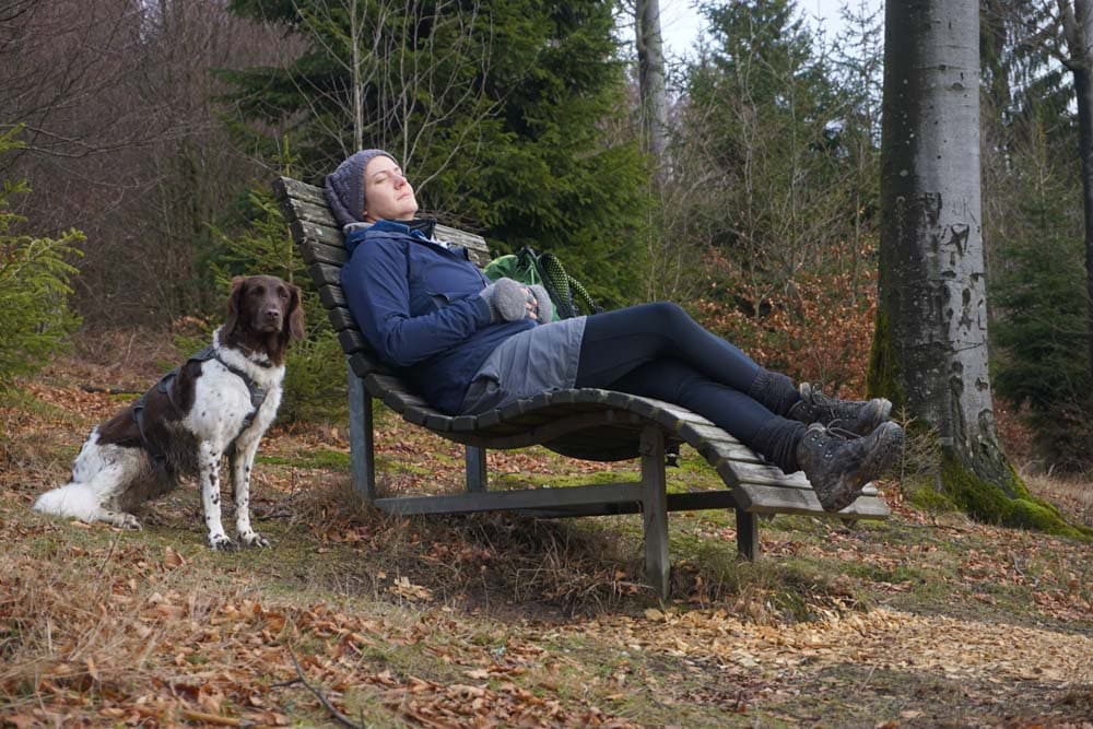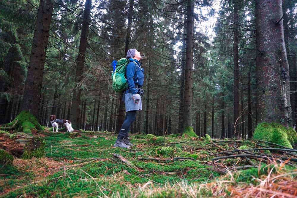 »Ist das dieses Waldbaden?«, frage ich meine Mitwanderin, als ich nach sechs Stunden strammer Wanderung im Dauerregen bis auf die Knochen nass bin. Sie lächelt, denn unter ihrem weiten Regenponcho ist sie deutlich trockener als ich unter meiner durchgeweichten Regenjacke. Selbst Wanderhund Lotte, eine Münsterländer-Dame, ergeht es unter ihrem Regenmantel besser als mir. Aber es sind nur noch wenige Minuten bis zur Unterkunft und dort wartet eine heiße Dusche auf mich. Beim Weitwandern unter solchen regnerischen Bedingungen gewinnen die kleinen Dinge im Leben eine große Bedeutung. Wann erfreuen wir uns im Alltag schon mal an der Selbstverständlichkeit einer heißen Dusche? Wer mehrere Tage zu Fuß in der Natur unterwegs ist, den Witterungsbedingungen – egal ob Regen, Sturm oder sengende Hitze – gnadenlos ausgeliefert ist, erkennt zwangsläufig den Wert alltäglichen Komforts.