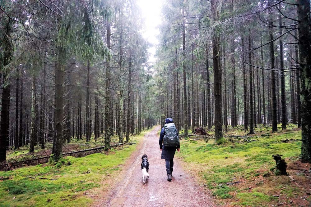 Diesen werde ich auf unserer 6-tägigen Wanderung tatsächlich noch drei Mal besonders wertschätzen, denn so oft komme ich nachmittags klitschnass im Hotel an. Der Wettergott hat es nicht sonderlich gut mit uns gemeint. Dennoch will ich dieses »Waldbaden« auf dem Rothaarsteig nicht missen. In den Hotels werden wir von Gastgebern in Empfang genommen, die auf Wanderer eingestellt sind und alte Handtücher für dreckige (aber glückliche) Wanderhunde bereithalten. Wir haben diesen riesigen Wald im Rothaargebirge fast ganz für uns allein und lernen die Natur ganz neu kennen. Dort hängen an grünem, sattem Moos glitzernde Regentropfen. An anderer Stelle umhüllt uns eine mystische Nebelstimmung wie aus dem Bilderbuch. Wir suchen mit viel Fantasie Märchengestalten in moosüberzogenem Totholz des naturbelassenen Waldes. Wir lauschen dem Zwitschern der Vögel, der Duft des feuchten, modrigen Waldbodens steigt uns in die Nase und wir spüren den kühlen Wind auf der Haut – Natur kann auch bei Regen unglaublich unterhaltsam sein.