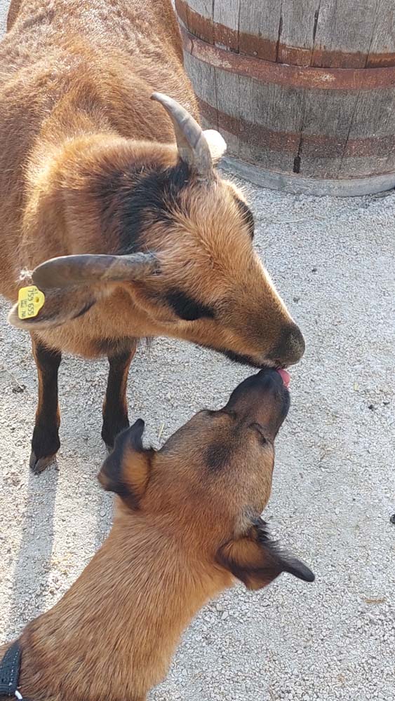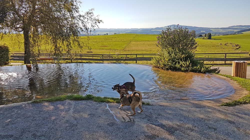 Da hier viele Tiere frei laufen können, ergab sich für unsere Hunde ein ganz selbstverständliches Kennenlernen anderer Tiere. Shelby mag ja grundsätzlich fast alle Lebewesen, aber besonders neugierig wird sie immer bei den Schweinen und Ziegen. Der Hundepfad mit dem Planschteich ist vor allem im Sommer beliebter Treffpunkt der Besucherhunde und deren Menschen. So haben auch wir Zweibeiner schon viele nette Menschen hier kennengelernt.