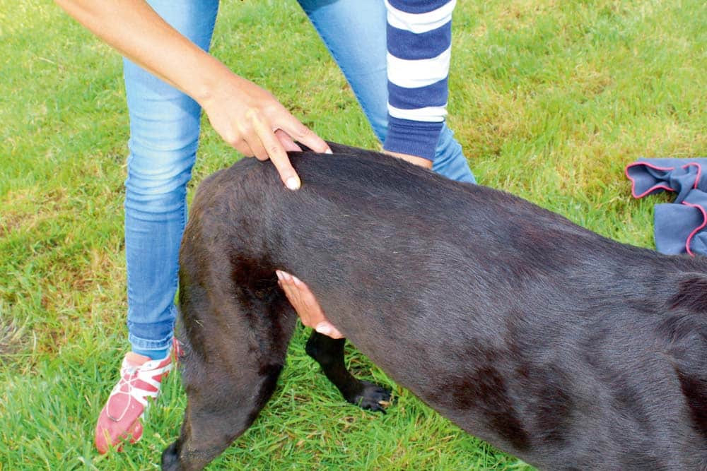 In dieser Übung dürfen Sie und Ihr Hund stehen. Unterstützen Sie mit Ihrer linken Hand Ihren Vierbeiner untergreifend im Flankenbereich. Spreizen Sie Ihren rechten Mittel- und Zeigefinger auseinander. Beginnen Sie mit mäßigem Druck am Halsansatz neben der Wirbelsäule bis zum Rutenansatz. Dies führen Sie in einer gleichmäßigen und flüssigen Bewegung aus. Auch hier ist das genaue Beobachten Ihres Hundes wichtig.
