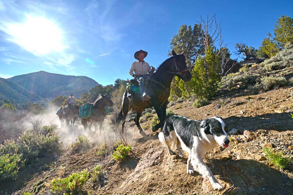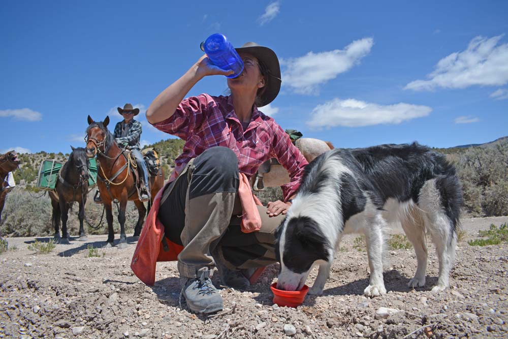 Eine schmale Jeep-Road führt uns durch den Copper Canyon bergauf. Pinien und Wacholdersträucher wachsen am Wegesrand. Ich fröstle und steige ab, um mich beim Gehen aufzuwärmen. Wir hatten uns vor den heißen Tagen in der Wüste Nevadas gefürchtet, doch jetzt ist es erstaunlich kalt für Anfang Mai. Auch die Wettervorhersage für die nächsten Tage klingt nicht gerade kuschelig. Nachts soll das Thermometer noch weit unter den Gefrierpunkt sinken. Trotzdem sind wir erleichtert, dass es so kalt ist. Denn unsere größte Sorge gilt Charlie. Sollte es für sie zu heiß werden, würden wir unseren Ritt durch Nevada sofort beenden. Doch mit den aktuellen Witterungsbedingungen hat Charlie keinerlei Probleme, im Gegenteil. Fröhlich springt sie vor den Pferden her, schnuppert fasziniert hier und dort, und springt trotz der Kälte voll Begeisterung in einen Tümpel, die einzige Wasserstelle, die wir an diesem Tag sehen.
