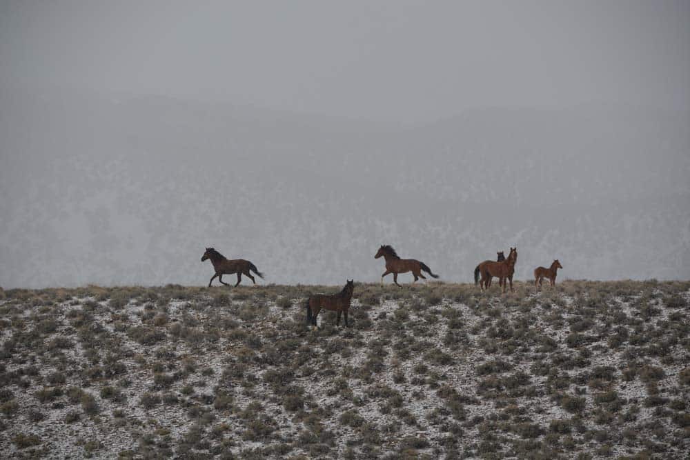 Rund 80.000 Wildpferde gibt es derzeit in den USA, die Hälfte davon, 40.000 Wildpferde, leben in Nevada. Auch meine beiden Pferde, Rusty und Lightfoot, sind auf den Prärien Nevadas aufgewachsen, bevor sie eingefangen wurden. Bisher hat uns der Anblick der Wildpferde immer begeistert, doch dass sie uns ausgerechnet jetzt, bei Einbruch der Dämmerung in unserem Lager besuchen wollen, gefällt uns gar nicht. Denn wilde Hengste können gegenüber Pferden, die in ihr Gebiet eindringen, aggressiv reagieren.