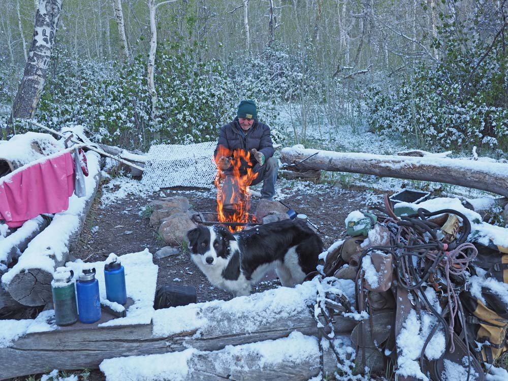 Im letzten Dämmerlicht sehen wir zwei Hengste, die außerhalb des Korrals mit den Vorderhufen scharren. Im Korral reagiert Dino mit ähnlichem Machtgehabe, während Rusty, Azabache und Lightfoot das Geschehen gebannt aus dem Hintergrund beobachten. Dino ist der kleinste unserer vier Wallache, doch er hat das größte Selbstbewusstsein. Immer wieder geben die Pferde hohe quietschende Laute von sich. Zu gerne würde ich noch länger beobachten, doch der altersschwache Zaun würde weiteren Annäherungen nicht standhalten und wir wollen keine Verletzungen riskieren. Im Dunkeln spannt Günter eine Highline zwischen den Bäumen rund um unser Zelt. Dort binden wir unsere Pferde für die Nacht fest. Immer wieder lauschen wir nachts auf Geräusche von draußen, doch wir bleiben ungestört. Nur die Kälte kriecht in dieser Nacht ganz tief in unsere Schlafsäcke. Das Thermometer sinkt auf minus 15 Grad. Das Wasser in unserer Faltschüssel friert zu einem soliden Eisblock. Ich überlege, ob ich Charlie zudecken soll. Doch sie schläft friedlich auf den Pferdedecken an meinem Fußende. Die Kälte kann ihr nichts anhaben.