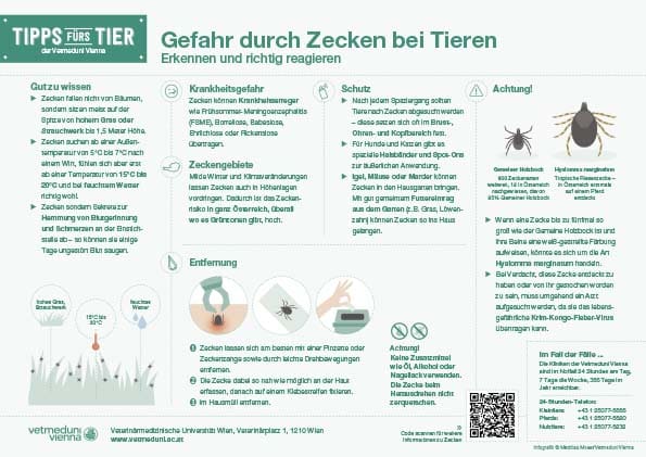 Mit den steigenden Temperaturen steigt auch die Gefahr von Zeckenstichen bei Mensch und Tier. Zecken sind nicht nur lästige Parasiten, sondern können auch gefährliche Krankheiten übertragen. Wer mit seinem Vierbeiner in der Natur spazieren geht, sollte deshalb ein wachsames Auge haben und über den Einsatz von Zeckenschutzmitteln und Erste-Hilfe-Maßnahmen im Fall der Fälle Bescheid wissen. Die Vetmeduni Vienna gibt dabei hilfreiche Tipps, sich und seinen Hund zu schützen.