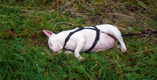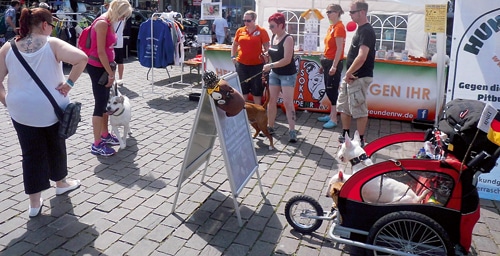 Zum Gedenken an einen von drei Männern auf ­offener Straße zu Tode geprügelten Bullterrier haben sich die beiden Bullterrier-Freunde Axel Keil und Daniela Weiland zu Fuß auf den Weg ­begeben – und zwar von Marburg nach Köln. Ihre drei Bullterrier hatten sie mit dabei.