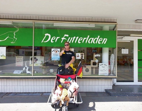 Ab dem dritten Tag hatten unsere Hunde leider so starken Muskelkater vom Laufen, dass wir sie alle drei in unseren Hundebuggy gesetzt haben und sie den Rest der Strecke geschoben haben. Wir sind in den sieben Tagen insgesamt 180 Kilometer gelaufen, haben im Zelt übernachtet und uns im Bach gewaschen. Als wir dann am 19. Juli in Köln ­ankamen, haben wir noch an einer Gedenkveranstaltung für alle getöteten Listenhunde der Welt teilgenommen.